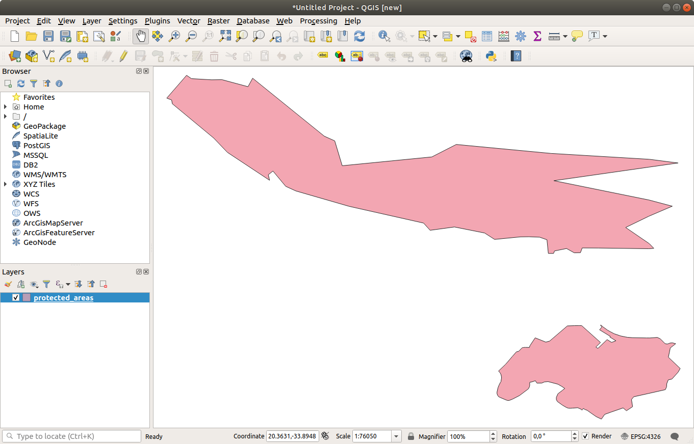 protected_areasitem in the Layers panel (bottom left) with its features shown in the main map canvas.