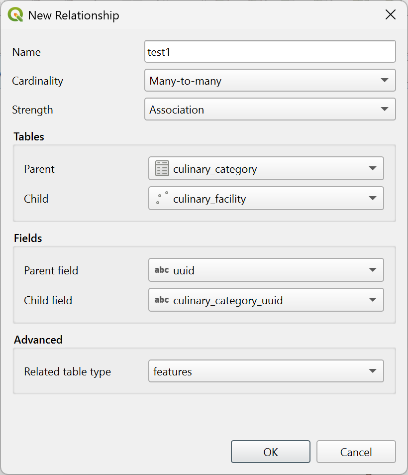 For some data types (e.g., GeoPackage, SpatiaLite or ESRI FileGeodatabase), QGIS also allows to create and edit the relations between the tables in the database. This can be managed through the Browser Panel. From the Browser panel, right-click on the database entry, select New relationship…, and in the new dialog, fill the following options: