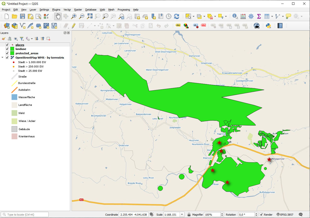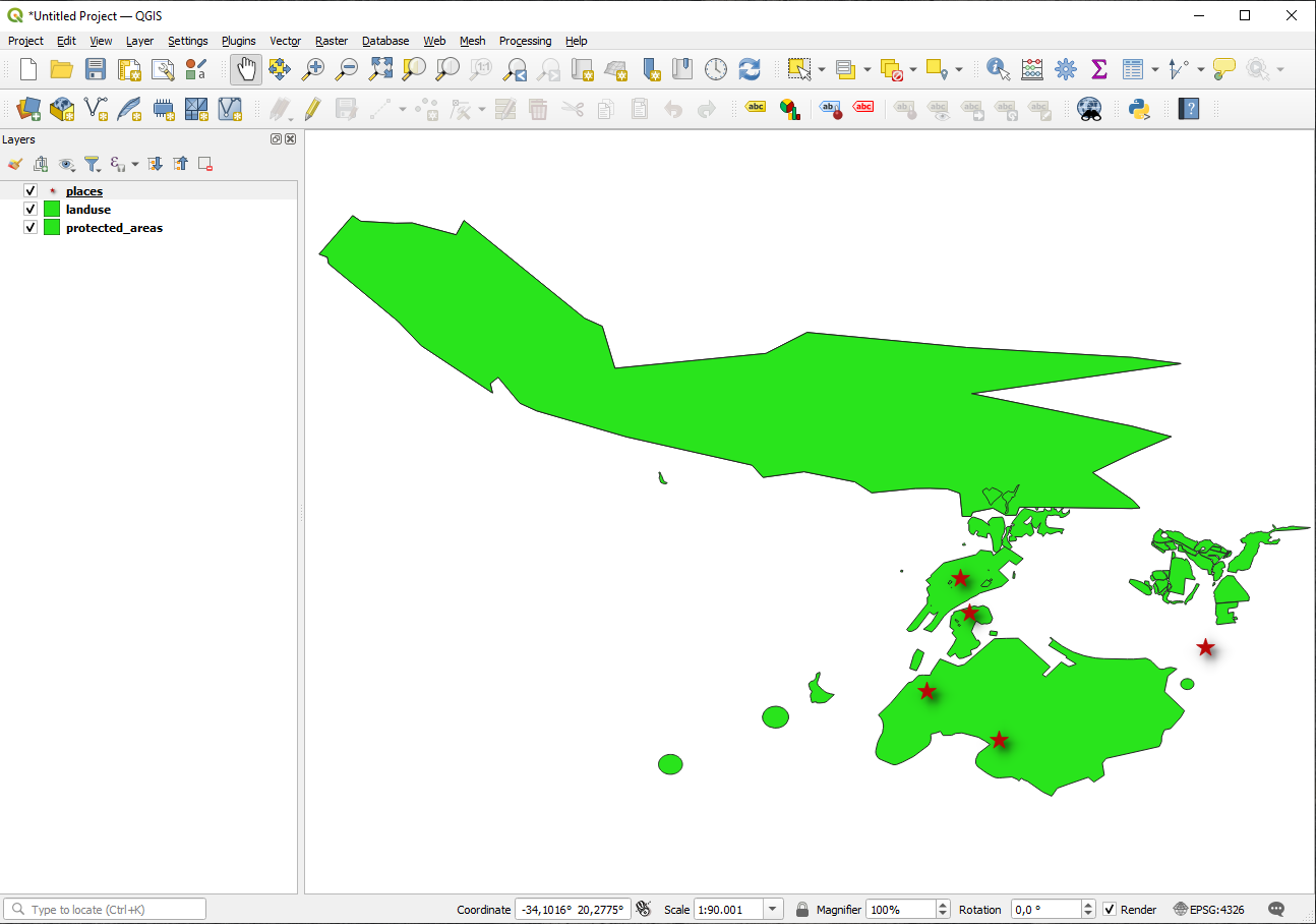 Now right-click on one of your own layers in the Layers panel and click Zoom to layer(s). You should see the Swellendam area:
