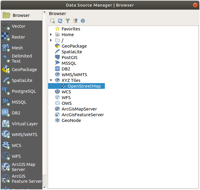 3. In the Browser tab, expand the XYZ Tiles drop-down menu and double-click the OpenStreetMap item.