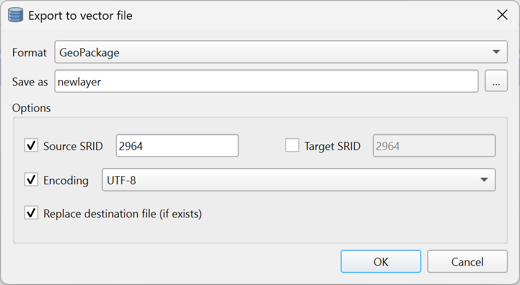 • checkbox Target SRID: Define the target SRID to reproject the geometries during the export process. By default, it uses the layer’s CRS.
