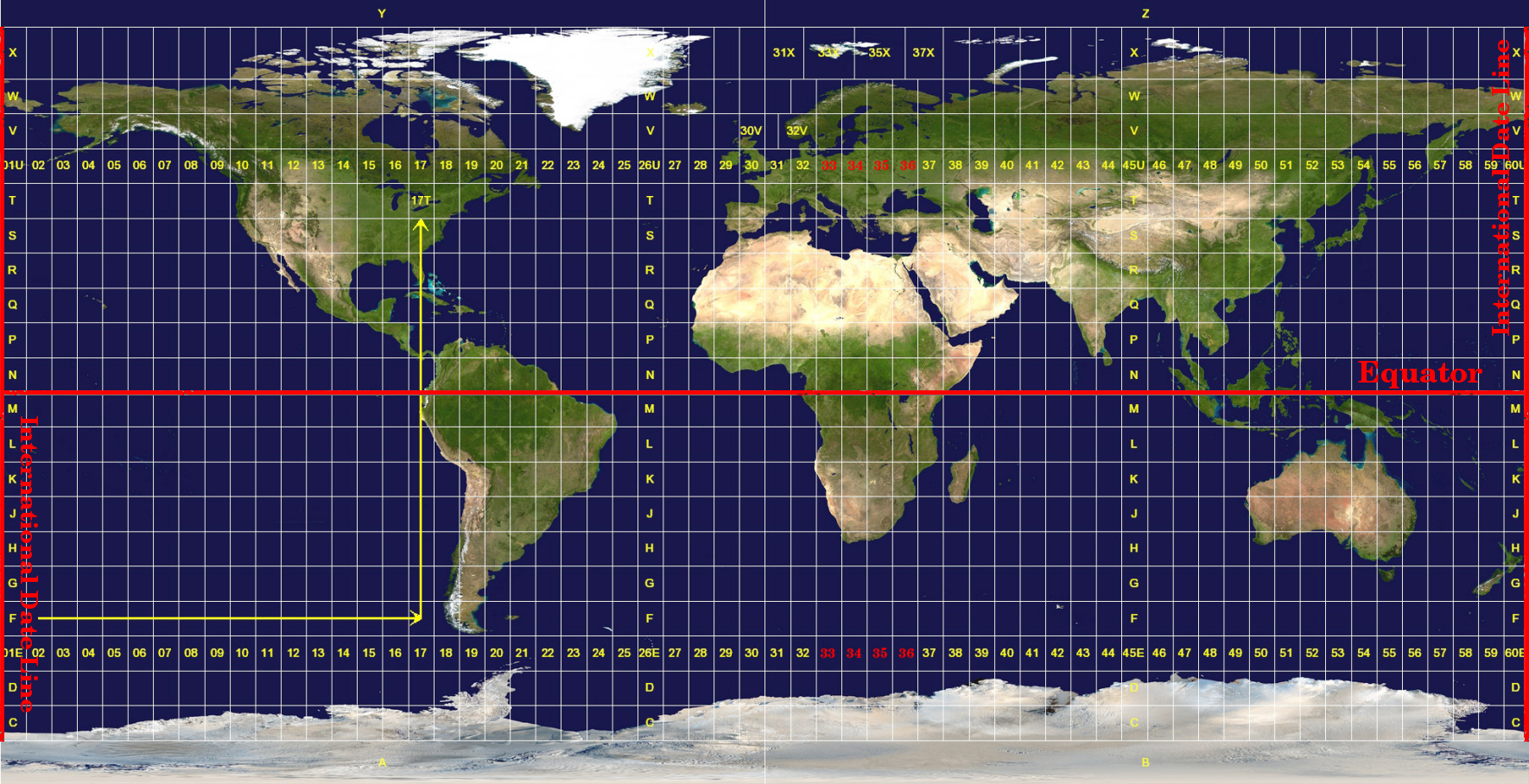 O local que procuramos é de 3.550.000 metros ao sul do equador, então o valor do norte (Y) recebe um sinal negativo e é -3.550.000 m. De acordo com as definições da UTM, precisamos adicionar um falso valor norte de 10.000.000 m. Isso significa que o valor norte (Y) de nossa coordenada é 6.450.000 m (-3.550.000 m + 10.000.000 m).