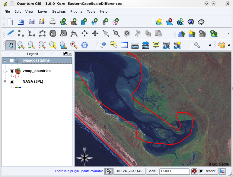 Map scale is an important issue to consider when working with vector data in a GIS. When data is captured, it is usually digitised from existing maps, or by taking information from surveyor records and global positioning system devices. Maps have different scales, so if you import vector data from a map into a GIS environment (for example by digitising paper maps), the digital vector data will have the same scale issues as the original map. This effect can be seen in illustrations Fig. 3.36 and Fig. 3.37. Many issues can arise from making a poor choice of map scale. For example using the vector data in illustration Fig. 3.36 to plan a wetland conservation area could result in important parts of the wetland being left out of the reserve! On the other hand if you are trying to create a regional map, using data captured at 1:1000 000 might be just fine and will save you a lot of time and effort capturing the data.