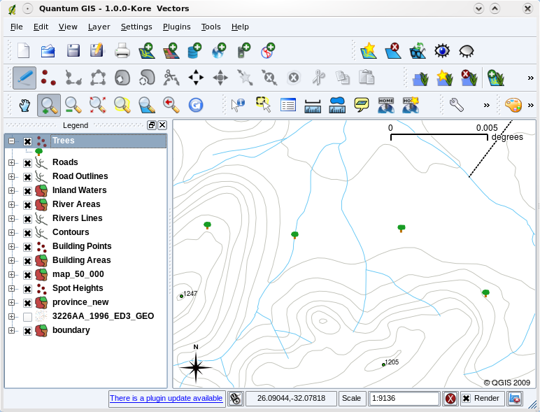Fig. 3.39 Quando uma camada (por exemplo a camada de árvores acima) é carregada pela primeira vez, o aplicativo de SIG irá mostrar esta com uma simbologia genérica.