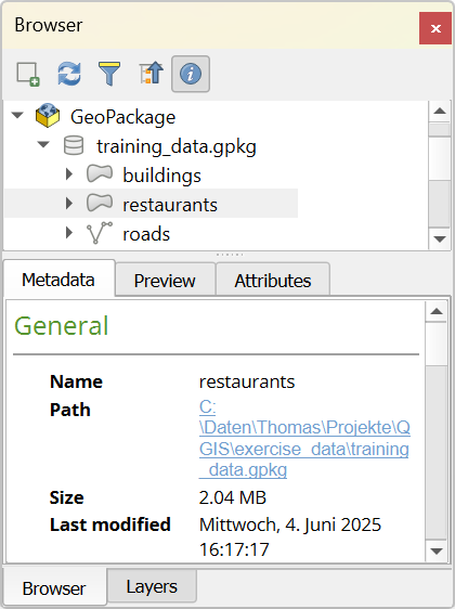Using the Browser panel you can locate, inspect and add data, as described in The Browser Panel. In addition, the Browser panel supports drag and drop of many QGIS resources, such as project files, Python scripts, Processing scripts and Processing models.