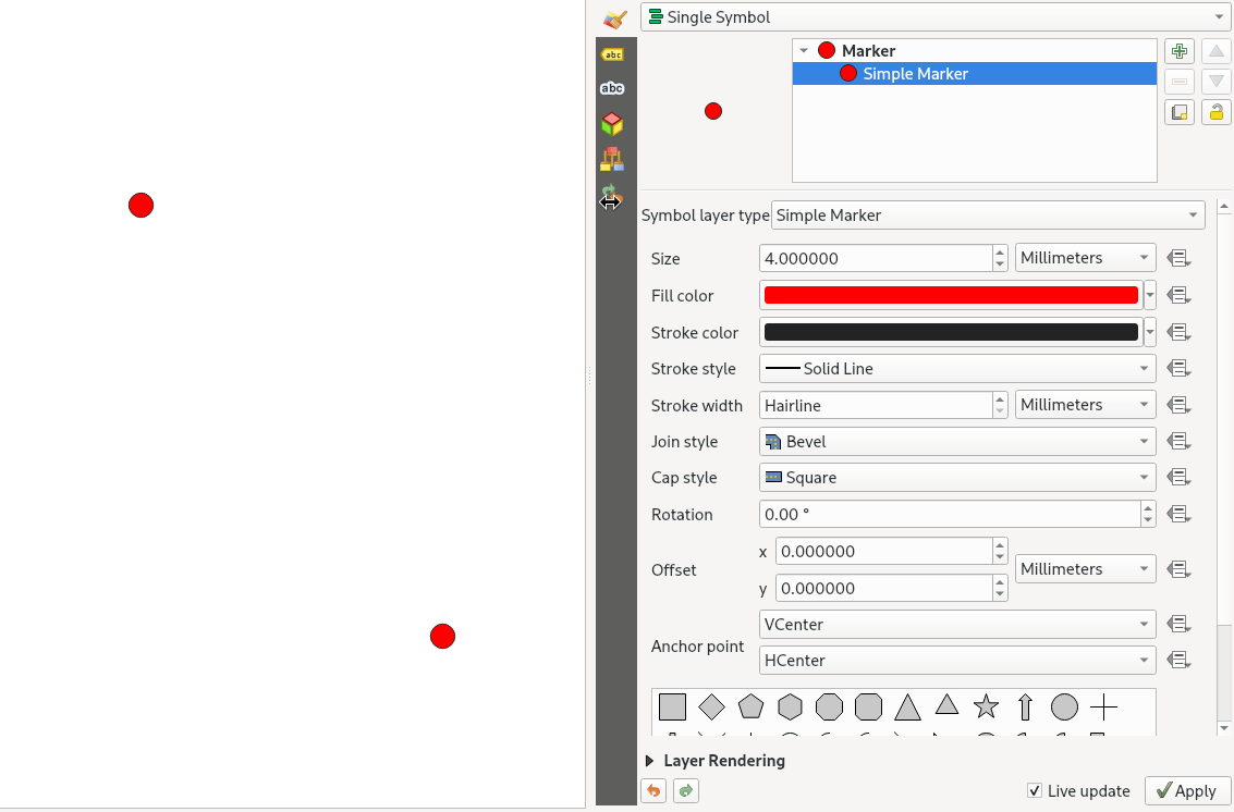 Appropriate for point geometry features, marker symbols have several Symbol layer types: