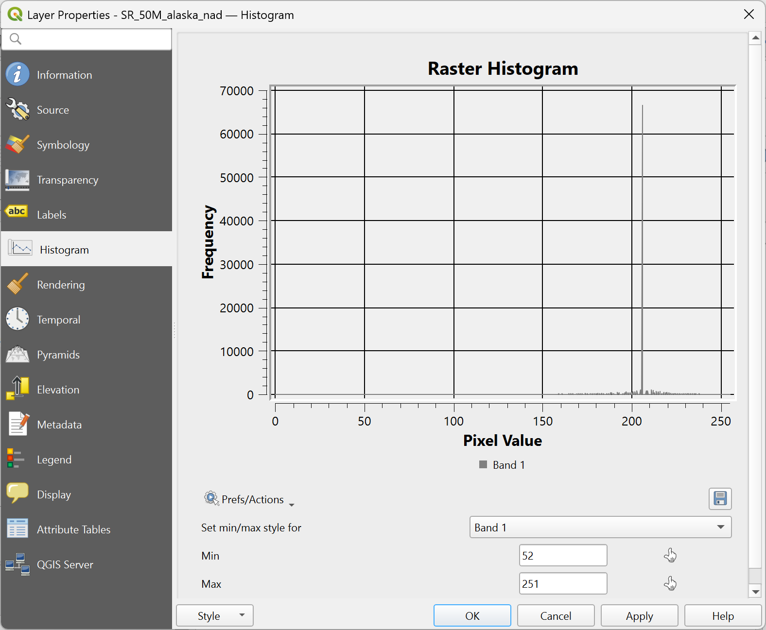 This renderer allows you to render a layer using only one band with a Color gradient: ‘Black to white’ or ‘White to black’. You can change the range of values to color (Min and Max) in the Min/Max Value Settings.