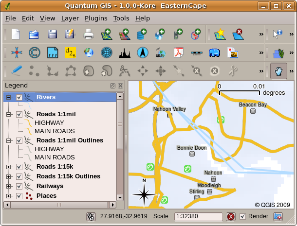 When you open a layer in the GIS Application it will appear in the map view. The map view shows a graphic representing your layer. When you add more than one layer to a map view, the layers are overlaid on top of each other. Look at figures Fig. 2.14, Fig. 2.15, Fig. 2.16 and Fig. 2.17 to see a map view that has several layers being added to it.