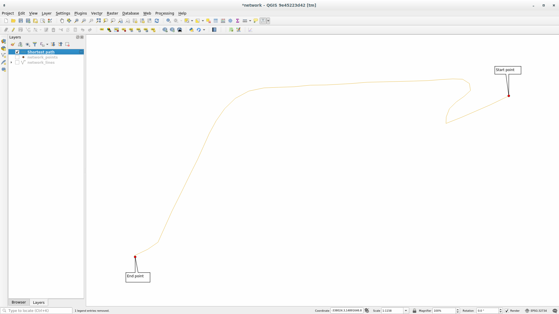 A new line layer is created representing the shortest path between the chosen points. Uncheck the